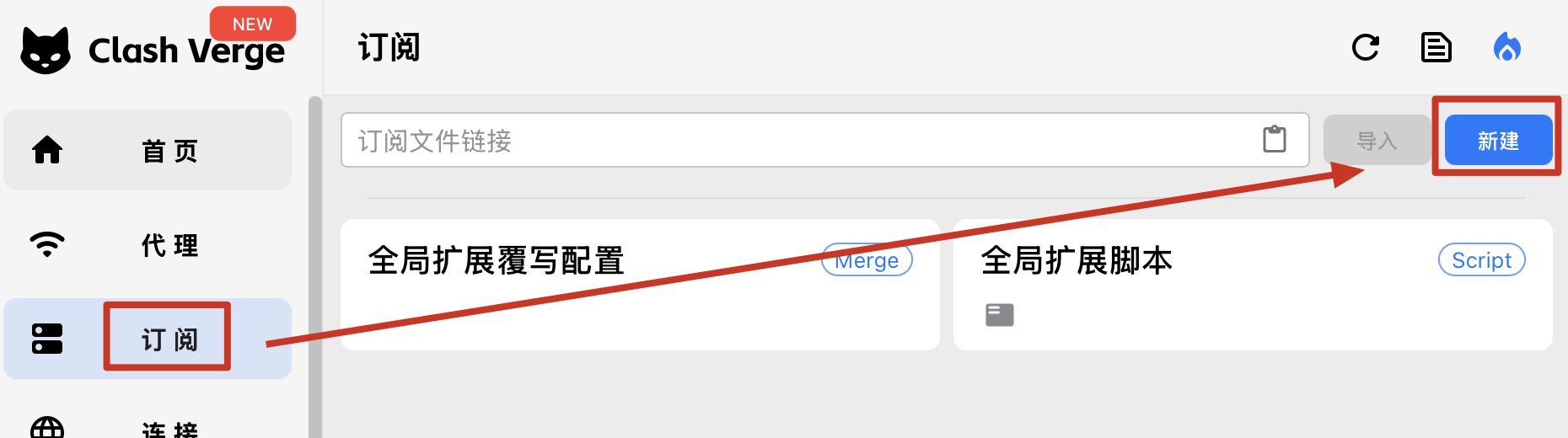 1. 在 Clash-verge 主面板上,左側點擊 Profiles ,點擊 New。